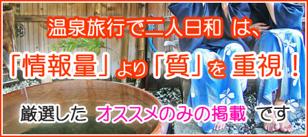 一般的な旅行雑誌やWEBサイトと違い、温泉旅行で二人日和は「カップル旅行・恋人旅行」に特化した情報を【量】ではなく【質】で選び抜いて掲載しています。カップルでの温泉旅行は、できるかぎり理想に近い旅行にしたいものです。